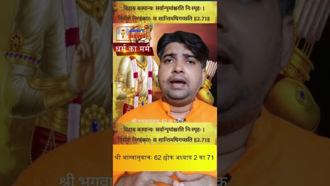 श्री भगवानुवाचः 62 वा श्लोक सांख्य योग अध्याय 2 का 71 श्रीमद भगवद गीता से भगवान कृष्ण के द्वारा कहे गए श्लोको का संग्रह कैप्शन श्री भग्वानुवाचः 62 वा श्लोक अध्याय 2 का 71 वा श्लोक जो पुरुष संपूर्ण कामनाओं को त्याग कर, अनुपयोगी, अहंकारी अनुपयोगी और स्प्रा अनुपयोगी विचरता है समान शांति को प्राप्त होती है अर्थात वो शान्ति को प्राप्त है इच्छा की इच्छा का त्याग करना है उसे मोह नहीं रखना है, घमंड नहीं करना है दुनिया में भी मनुष्य से दुनिया से अलग है ऐसे इंसान को शान्ति प्राप्त है ठीक वही होता है जो परेशान बिना अपनी धुन में अपने काम में लगा रहता है सफलता उसी के पाँव चूमती है TAGS #geetagyan #geetasaar #geethagovindam #shorts #viral #shortsvideo #adhyay2 #verse71 #knowledge #adhyatamvideo #dharamkaram #geetashorts #viraladhyatama #youtubeadhyatam #ytadhyatamshorts #spirituality #spirtualawakening #spritual #awarenews24 अवेयर न्यूज 24 चैनल अन्य लिंक:- फॉलो अवेयर न्यूज 24 ऑन : https://www.instagram.com/awarenews24/ लाइक अवेयर न्यूज 24 ऑन : https://www.facebook.com/awarenews24/ अवेयर न्यूज 24 को फॉलो करें : https://twitter.com/awarenews24 सब्सक्राइब करें : https://www.youtube.com/awarenews24 वेब : http://awarenews24.com वेब : https://www.minimetrolive.com विज्ञापनों के लिए हमें यहां ई-मेल करें: Awarenews24@awarenews24.com अवेयर न्यूज 24 मेंटर और कोच (आनंद कुमार) डेस्क लिंक सब्सक्राइब करें: https://www.youtube.com/@SmallTalkAnand लाइक करें आनंद कुमार: https://www.facebook.com/anandydr आनंद कुमार को फॉलो करें: https://twitter.com/ anandydr आनंद कुमार का पालन करें: https://www.instagram.com/anandydr/ अस्वीकरण: – कॉपीराइट अधिनियम 1976 की धारा 107 के तहत कॉपीराइट अस्वीकरण, आलोचना, टिप्पणी, समाचार रिपोर्टिंग जैसे उद्देश्यों के लिए “उचित उपयोग” के लिए अनुमति दी जाती है , शिक्षण, छात्रवृत्ति, शिक्षा और अनुसंधान। उचित उपयोग कॉपीराइट क़ानून द्वारा अनुमत उपयोग है जो अन्यथा उल्लंघनकारी हो सकता है।