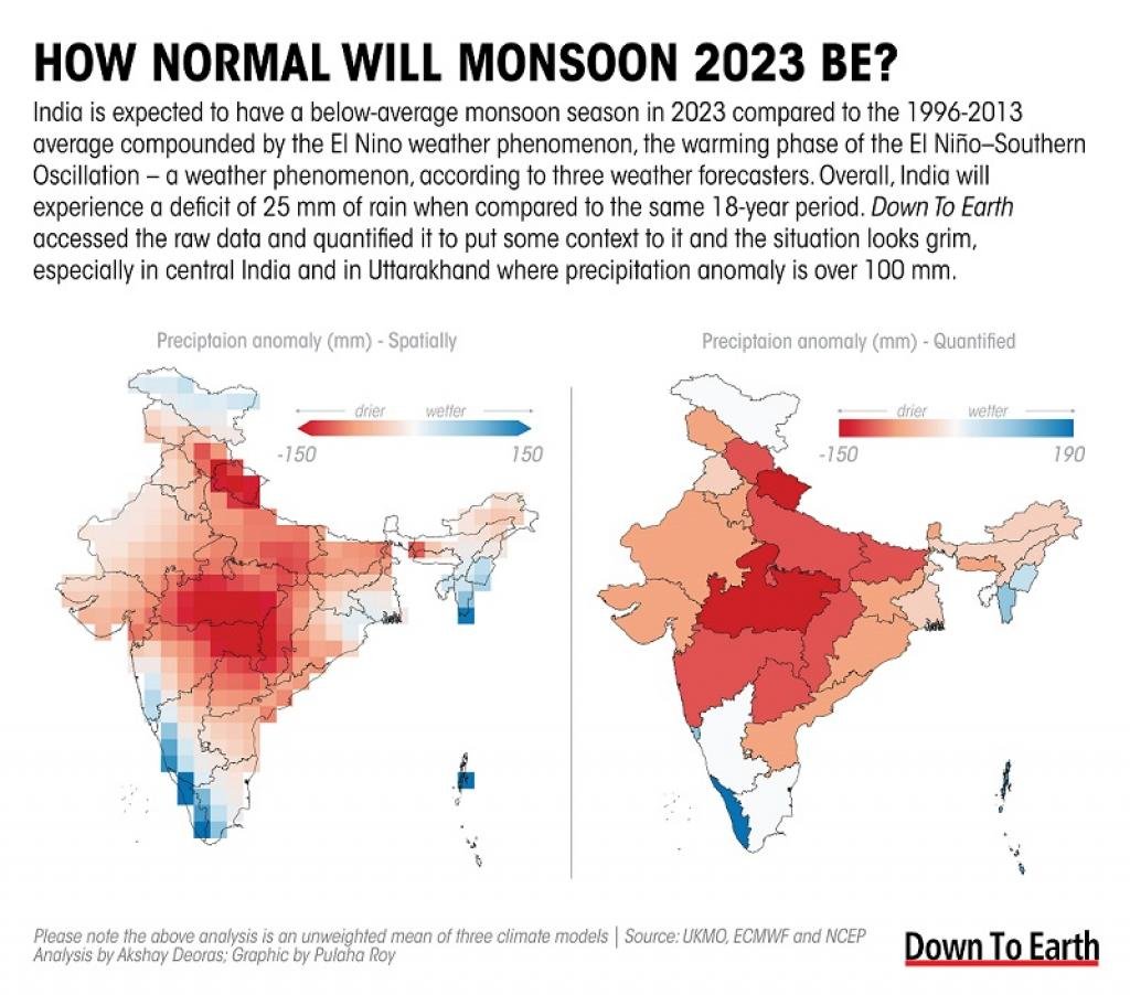 मानसून पर अल नीनो का असर जून से शुरू होने की उम्मीद है। प्रमुख जलवायु मॉडल जून से सितंबर के दौरान भारत के कई हिस्सों में औसत से कम मौसमी बारिश की भविष्यवाणी कर रहे हैं डाउन टू अर्थ (डीटीई)।