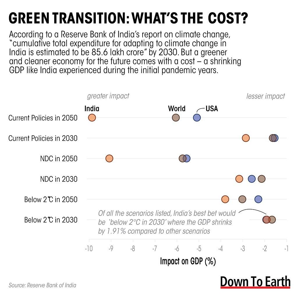 भारतीय रिजर्व बैंक के अनुसार, 2030 तक भारत में जलवायु परिवर्तन को अपनाने के लिए संचयी कुल व्यय 85.6 लाख करोड़ रुपये होने का अनुमान है।