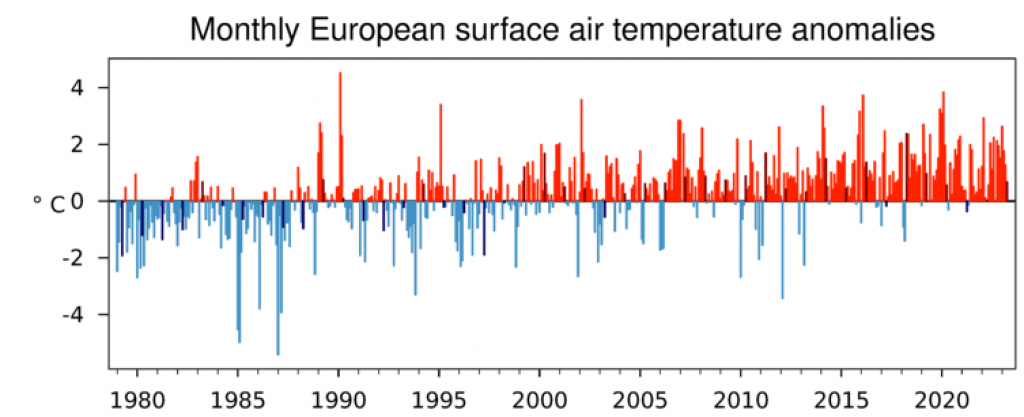 मार्च 2023 में, पूरे यूरोप में तापमान में तीव्र विपरीतता देखी गई। दक्षिण-पश्चिम यूरोप में, तापमान 1991-2020 की संदर्भ अवधि से काफी ऊपर था, स्पेन और पुर्तगाल ने अप्रैल में अपना उच्चतम तापमान दर्ज किया। नॉर्डिक देशों, पश्चिमी रूस और मोरक्को में भी उच्च तापमान देखा गया।