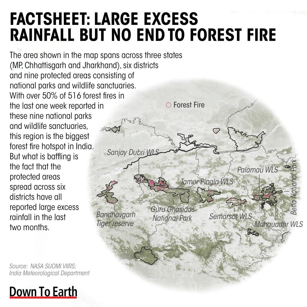 जबकि व्यावहारिक यह पता नहीं लगा सके कि ये जंगल की आग प्राकृतिक थी या मानव-प्रेरित, जो बात चौंकाने वाली है वह यह है कि सभी छह जिलों में जहां राष्ट्रीय उद्यान स्थित हैं, पिछले दो महीनों में अत्यधिक वर्षा दर्ज की गई है।