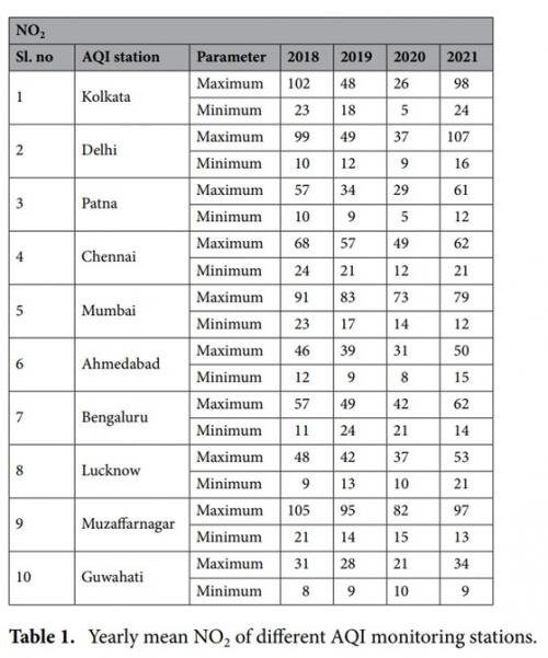 कोलकाता के सात AQI निगरानी स्टेशनों में नाइट्रोजन डाइऑक्साइड के उच्च स्तर देखे गए: 2018 में 102, 2019 में 48, 2020 में 26 और 2021 में 98। दिल्ली में भी उच्च NO2 भिन्नता दर्ज की गई; 2018 में 99, 2019 में 49, 2020 में 37), और 2021 में 107।