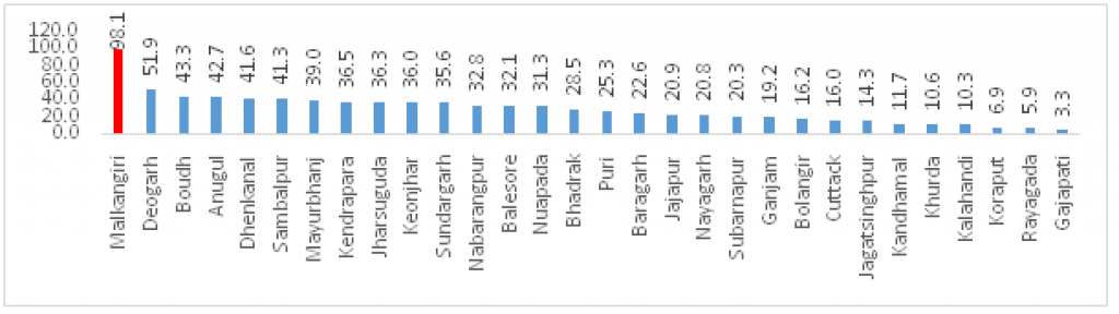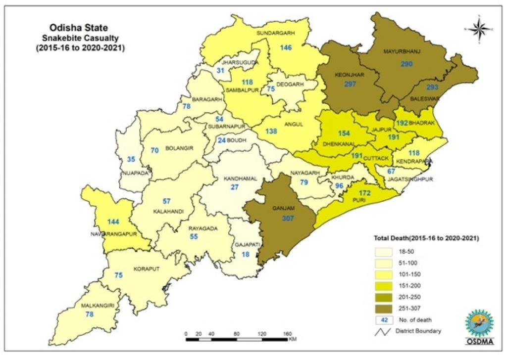 जिलों में, मलकानागिरी (98), आदिवासी और घने जंगल बहुल जिले में सर्पदंश से सबसे अधिक मौतें हुईं और गजपति (3.3), सबसे कम।