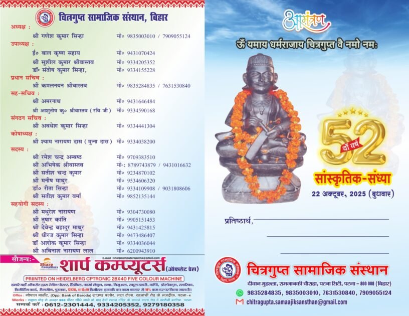 चित्रगुप्त सामाजिक संस्थान के प्रधान सचिव श्री कमलनयन श्रीवास्तव और अध्यक्ष श्री गणेश कुमार सिन्हा ने बताया कि सम्पूर्ण प्राणी-जगत के पाप-पुण्य का लेखा-जोखा करने वाले कलमजीवियों के आराध्य देव, अक्षर देवता भगवान श्री चित्रगुप्त पूजनोत्सव, 2025 की पूर्व संध्या पर चित्रगुप्त सामाजिक संस्थान, बिहार के तत्वावधान में गिरिराज उत्सव पैलेस, बेलवर गंज, पश्चिम दरवाजा, पटना सिटी में आगामी 22 अक्टूबर 2025 (बुधवार को 2:00 बजे ‘सांस्कृतिक संध्या’ का आयोजन किया गया है। उन्होंने बताया कि इस कार्यक्रम में शिरकत करने के लिये पूर्व केन्द्रीय मंत्री एवं सांसद (लोकसभा) श्री रविशंकर प्रसाद,बिहार विधान सभा के अध्यक्ष श्री नन्द किशोर यादव, पूर्व राज्यपाल श्री गंगा प्रसाद, ख्यातिनाम चिकित्सक पद्मश्री डॉ. गोपाल प्रसाद सिन्हा, आरक्षी महानिदेशक आलोक राज, न्यायमूर्ति हेमंत कुमार श्रीवास्तव, न्यायमूर्ति अमरेश कुमार लाल को आमंत्रित किया गया है।