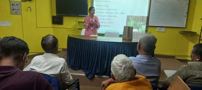 उन्होंने हमें ऑस्मोटिकली डिहाइड्रेटेड उत्पादों, कुचले हुए टमाटर प्रौद्योगिकी और ताजी कटी सब्जियों के बारे में बताया। डॉ. जयंती माला बी. आर. वरिष्ठ वैज्ञानिक, कीट प्रबंधन को धन्यवाद। उन्होंने आम के बाग के प्रमुख कीट-पतंगों और उनके प्रबंधन के बारे में बताया।