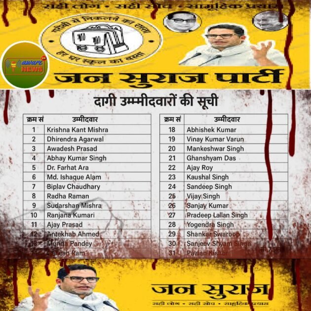 जनसुराज ने ये लिस्ट जारी की जब अपराधिक छवि वाले कैंडिडेट की चर्चा होने लगी तब पार्टी ने आनन फानन में लिस्ट फेसबुक पर लगा दिया है C7 फॉर्म के साथ वही चुनाव आयोग की वेबसाइट पर लिस्ट इंतनी साफ़ नही है अब जो पार्टी दागियो को टिकट न देने की बात कर रही थी उन्होंने आम जनता का हवाला देते हुए कहा है की वहां के लोगो का डिमांड था इसलिए टिकट दिया गया है।