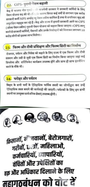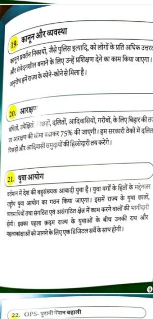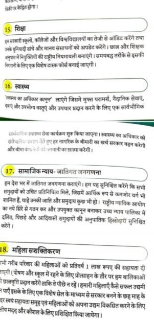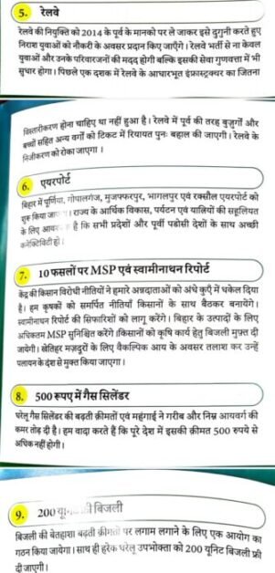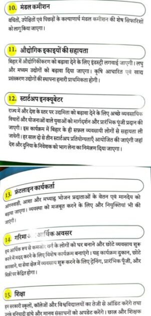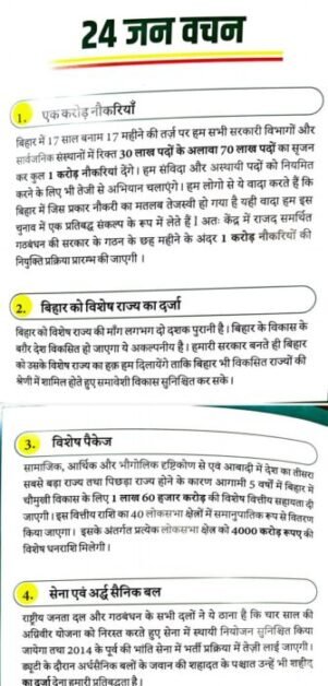 घोषणापत्र में एक करोड़ नौकरियाँ प्रदान करने की प्रक्रिया शुरू करना भी शामिल है; बिहार को विशेष दर्जा; बिहार को ₹1.60 लाख करोड़ का विशेष पैकेज; चार साल की अग्निवीर भर्ती नीति को समाप्त करने के साथ-साथ 2014 से पहले की प्रक्रिया के तहत रक्षा में भर्ती; बेरोजगारी ख़त्म करने और रेलवे में निजीकरण रोकने के लिए रेलवे में भर्ती; रसोई गैस सिलेंडर ₹500 पर; 200 यूनिट तक मुफ्त बिजली; मंडल आयोग की सिफ़ारिशों को लागू करना और स्वास्थ्य, शिक्षा, पर्यटन और कानून व्यवस्था के क्षेत्रों में सुधार करना।