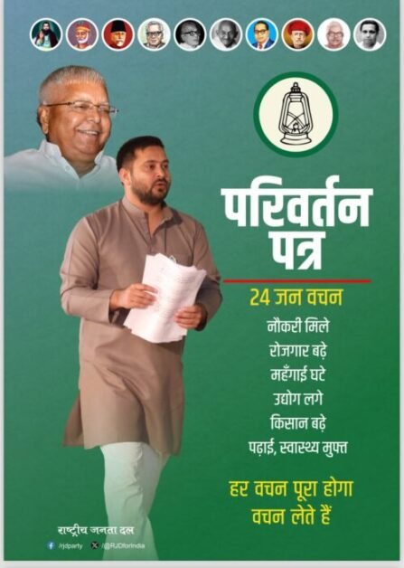 राजद ने पार्टी नेता और पूर्व उपमुख्यमंत्री तेजस्वी यादव और पार्टी के अन्य वरिष्ठ नेताओं द्वारा जारी अपने घोषणापत्र में कुल मिलाकर 24 वादों पर प्रकाश डाला है।